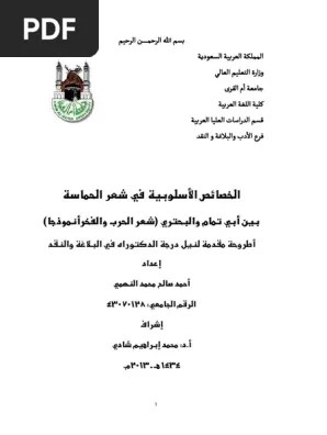 مؤلف :حبيب بن أوس الطائي أبو تمام ; حصريا تحميل كتاب الحماسة الصغرى الشعر الجاهلى مجاناً pdf اونلاين 2022 يتناول الكتاب الحديث عن الذى يعتمد مذهب القصيدة وهو يجمع الوانا من كل فن عرفه الشعرثم . فخصصته إلبراز خصائص البنية اإليقاعية اخلارجية يف الشعر . Want to translate a pdf to a language you read? الخصائص الأسلوبية في شعر الحماسة بين أبي تمام والبحتري شعر .